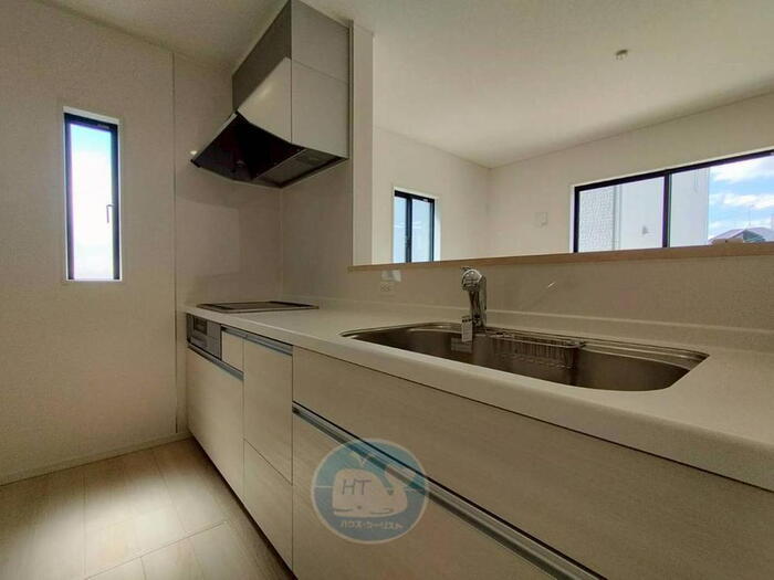 「いつものごはんに、ちょっとしたワクワクを。」 会話が弾むカウンターキッチン♪ キッチン越しの微笑みが、今日のごはんのスパイスに☆ オール電化の安心設計で、お子さまのお手伝いデビューにもぴったり◎