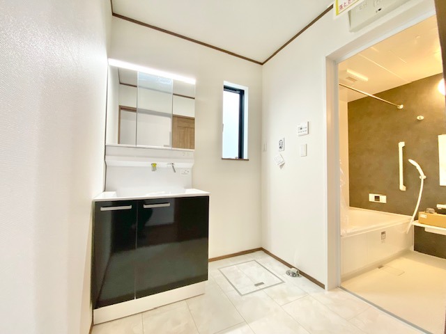 シャワー機能付き洗面台は広めの洗面ボウル、3面鏡なので収納スペースもあり洗面周りはスッキリ片付きます。