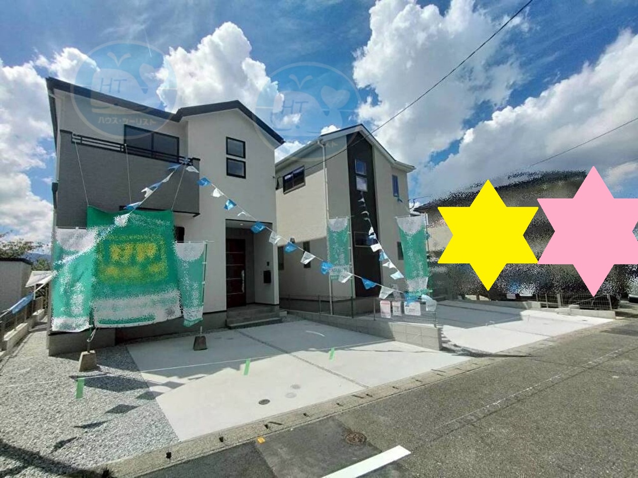 【全体写真】 左が1号棟◇右が2号棟 待ち望んだ我が家の舞台、ついに完成。 ここから 心はずむ日々のスタートです。