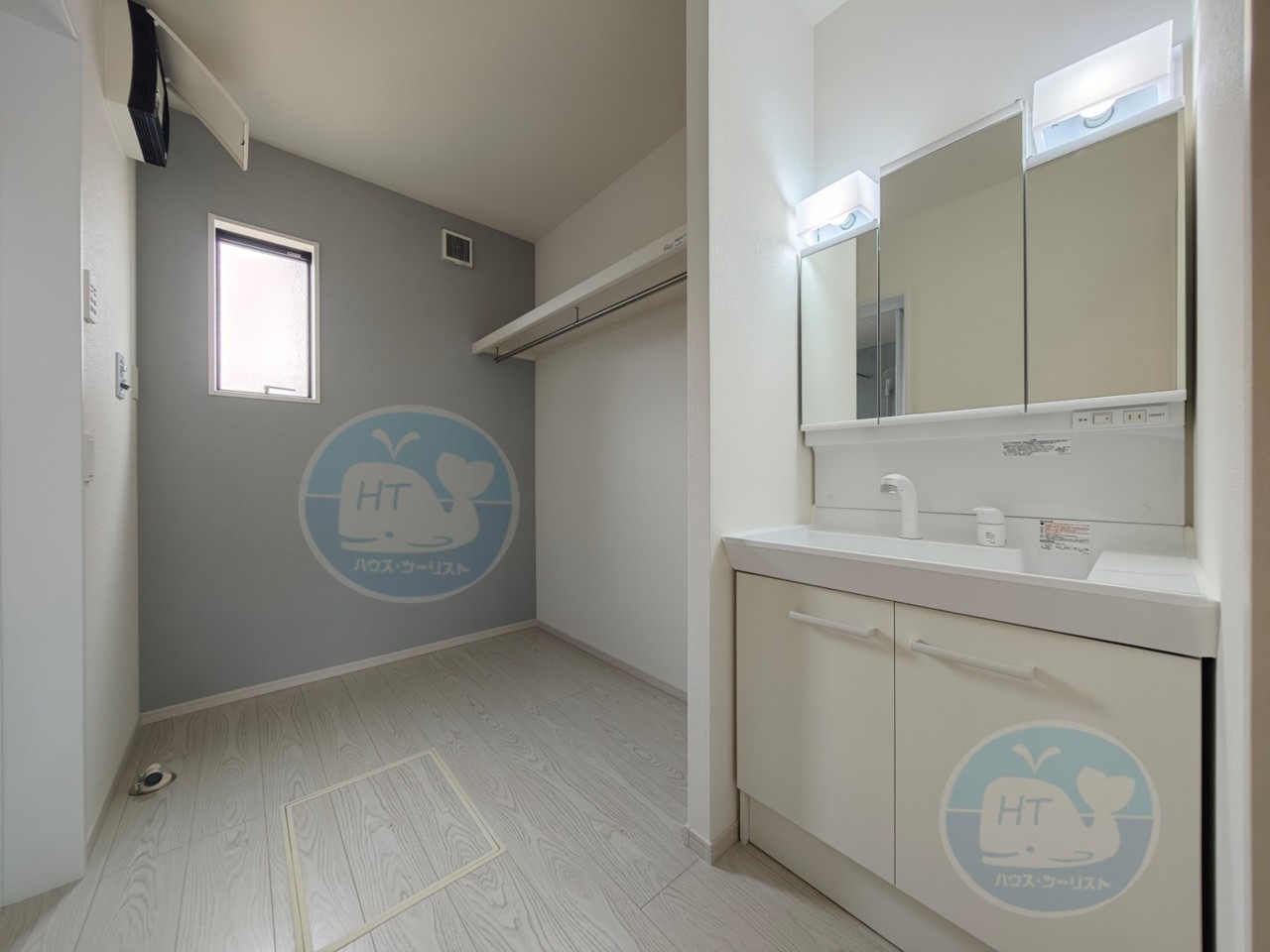 家事ラクを叶える工夫が満載の洗面脱衣室。洗面台横のハンガーパイプ付き収納で“干す・しまう”が一度に完結! 三面鏡の裏には、細かな小物もすっきり収納。