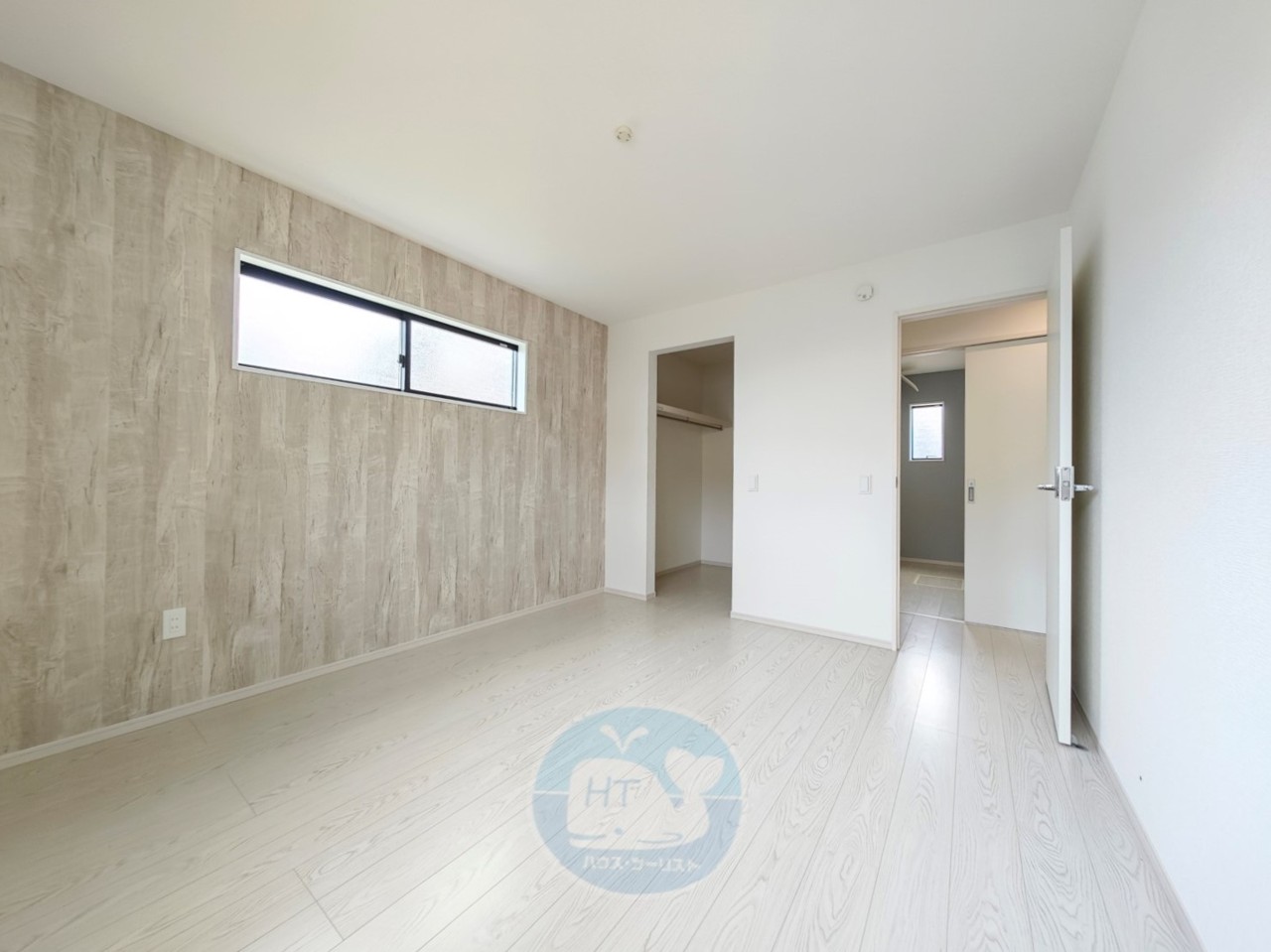 【洋室7帖】 暮らしにゆとりをプラス。WICを設けた主寝室♪ 「色とデザインで引き立てる、アクセントクロスの魔法」 余白を愉しむ、白のミニマルな美しさ☆