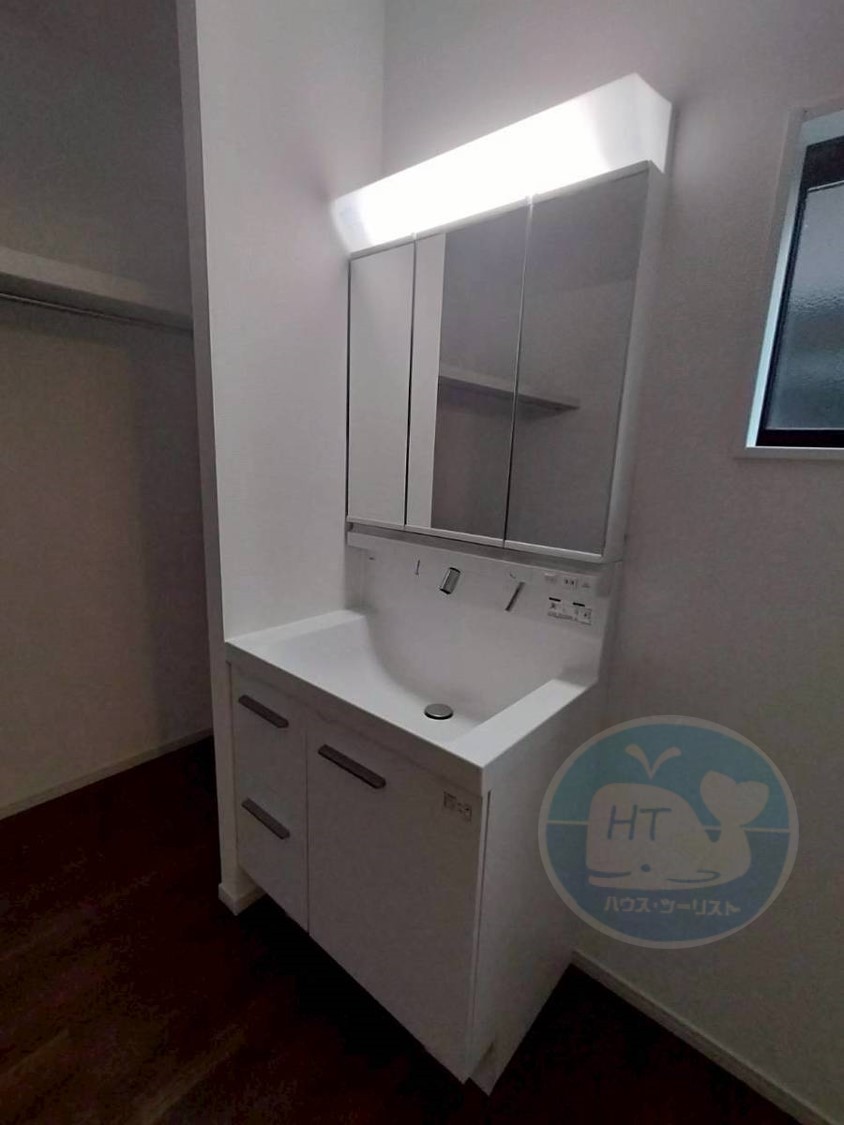 小物類は三面鏡の後ろへスマートに収納☆身だしなみも細かくチェック♪ 身支度を整えたら、もう一歩先のおしゃれへ。 洗面台横にハンガーパイプ付き収納もあり、すっきり整ったライフスタイル◎
